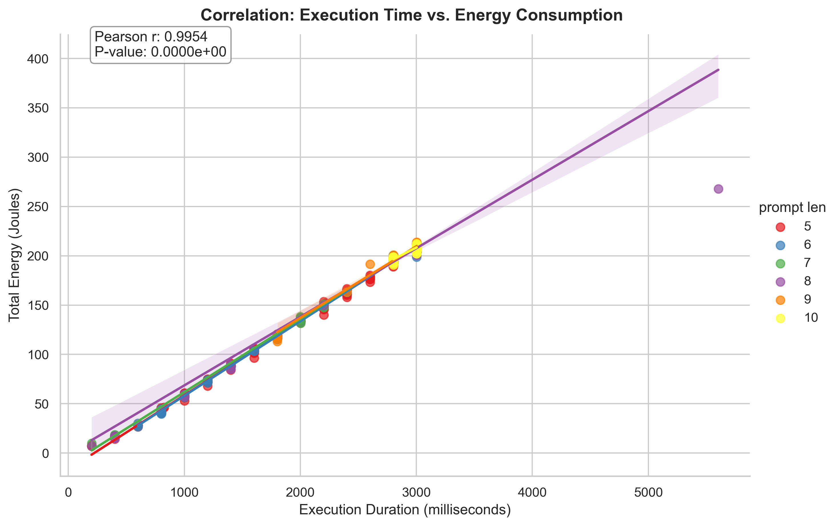 What we also noticed is that there is an almost perfect linear correlation between the time taken to generate a response and the energy consumed, which is expected as energy is power multiplied by time, and power is relatively stable across different executions of the same prompt. So we can conclude that the variance in energy consumption is mostly due to the variance in time taken to generate a response.