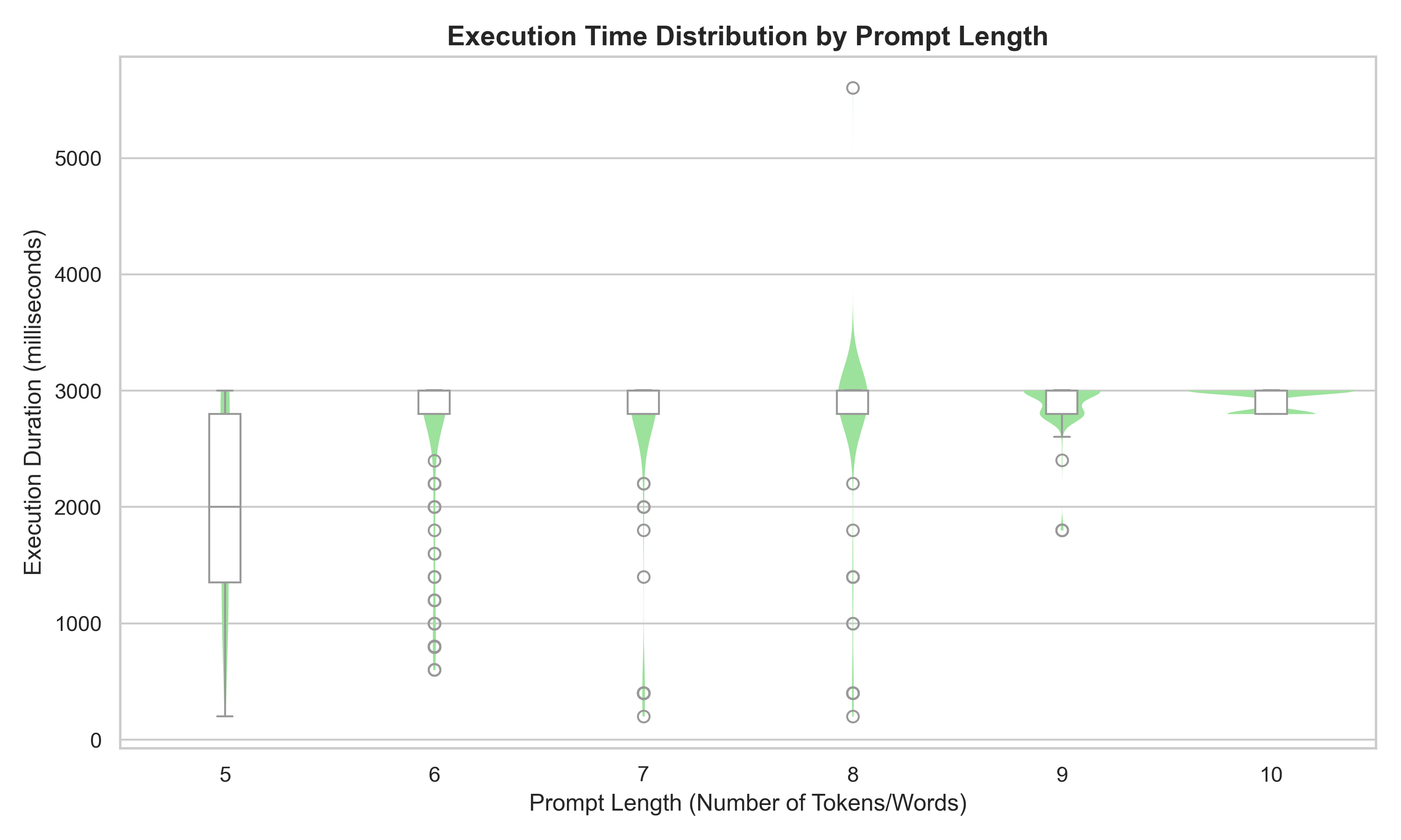 In this next plot we can see the execution duration and the prompt length is very similar compared to the energy consumption plot, which is expected as energy is power multiplied by time, and power is relatively stable across different executions of the same prompt.