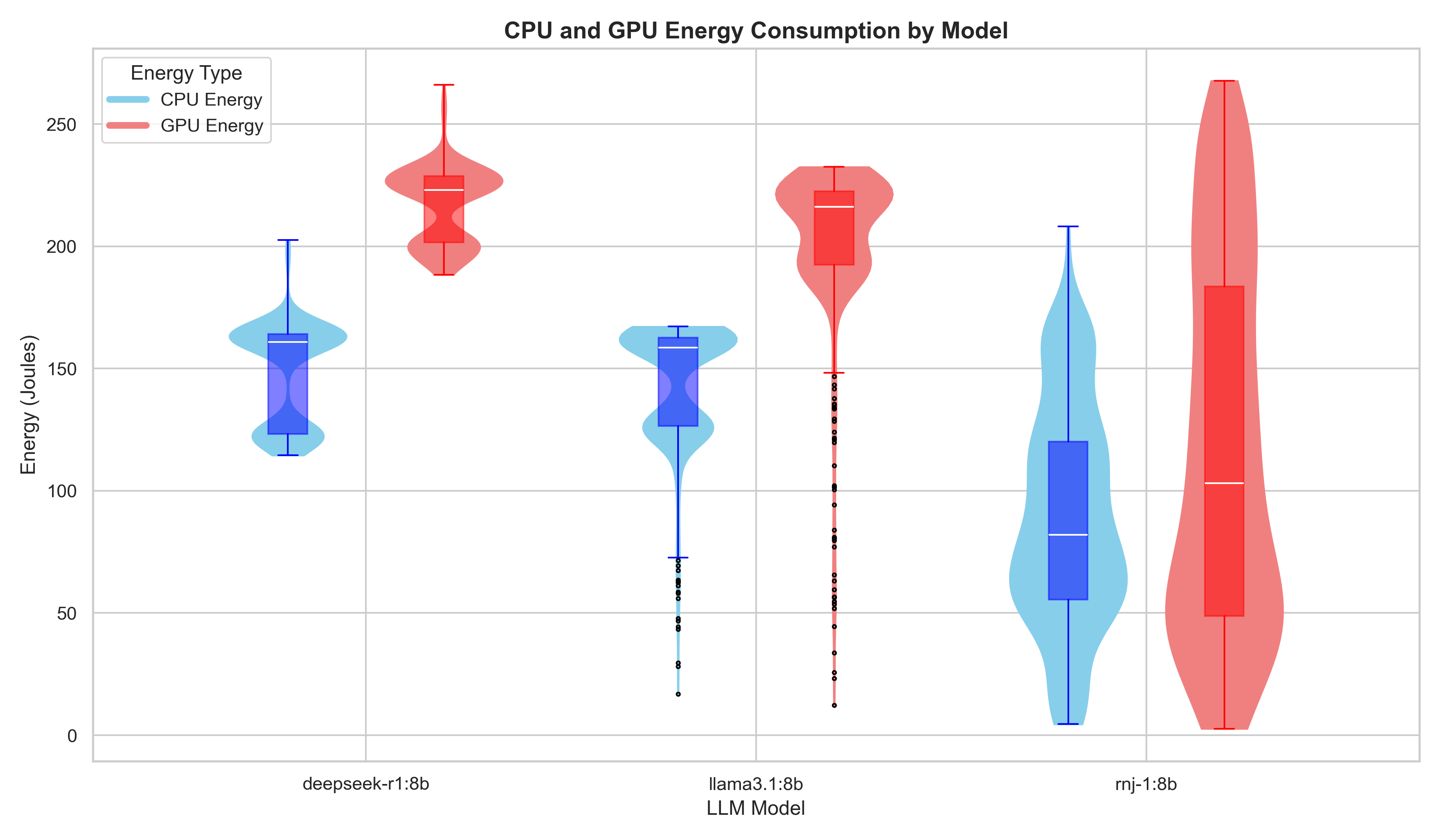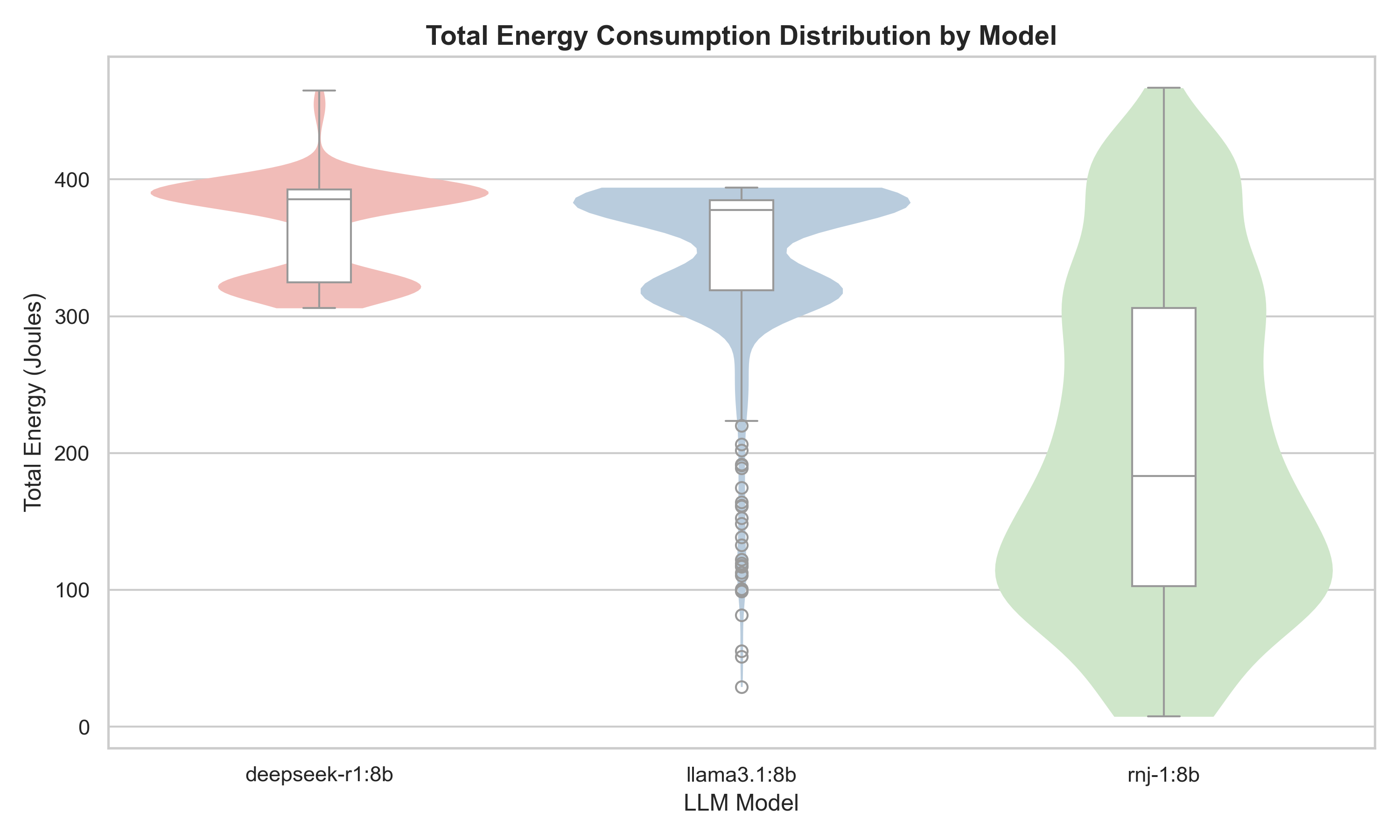 The main pattern is that model choice has a clear effect on both execution time and energy use. Across the same prompt set and repetitions, rnj-1:8b is generally the fastest and lowest-energy model, llama3.1:8b is in the middle, and deepseek-r1:8b tends to be the slowest and most energy-intensive. We also see that rnj-1:8b has a wider spread in some plots, which suggests less consistent run-to-run behavior than the other two models. We must, however, note that a lower energy consumption or faster runtime is not necessarily an indication of better performance, as the quality of the produced result is not evaluated. One measurement with negative total energy was removed in the plotting step, indicating a likely sensor/measurement artifact rather than real negative consumption.