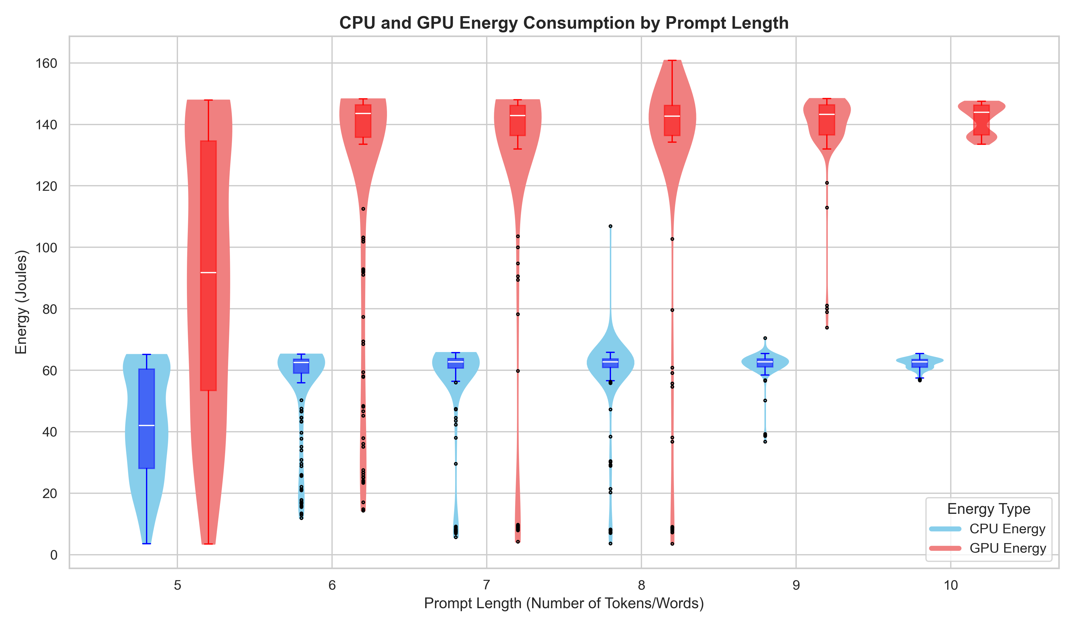 In the plot below, we can see the average energy consumption of the LLM for each prompt length. The main difference we can see is that the spread of the energy consumption for the 5-word prompts is much bigger than the 10-word prompts.