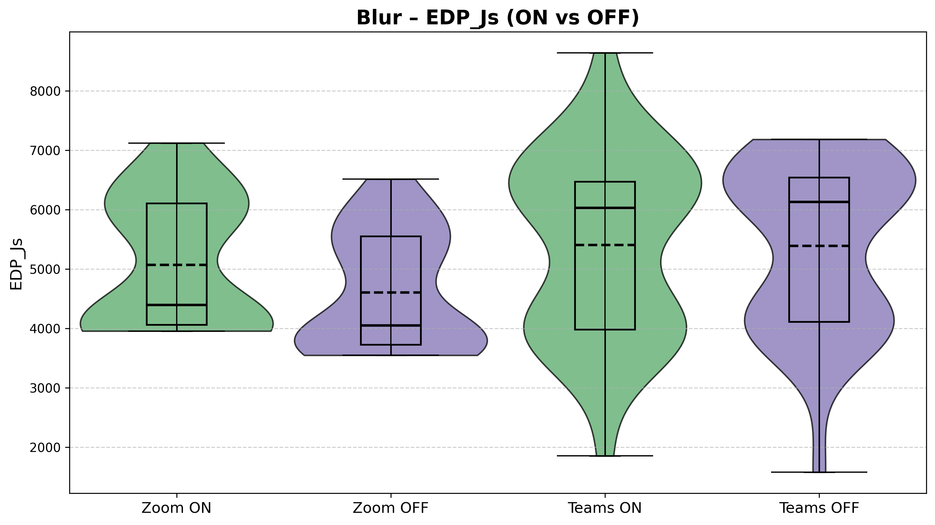 Between applications, camera ON produced large EDP effect size, indicating practical differences under active video conditions. For blur and screen sharing, effect sizes were generally small, suggesting that the platform differences are less pronounced. Thus, the most significant cross-application difference concerns the camera usage rather than the other features.