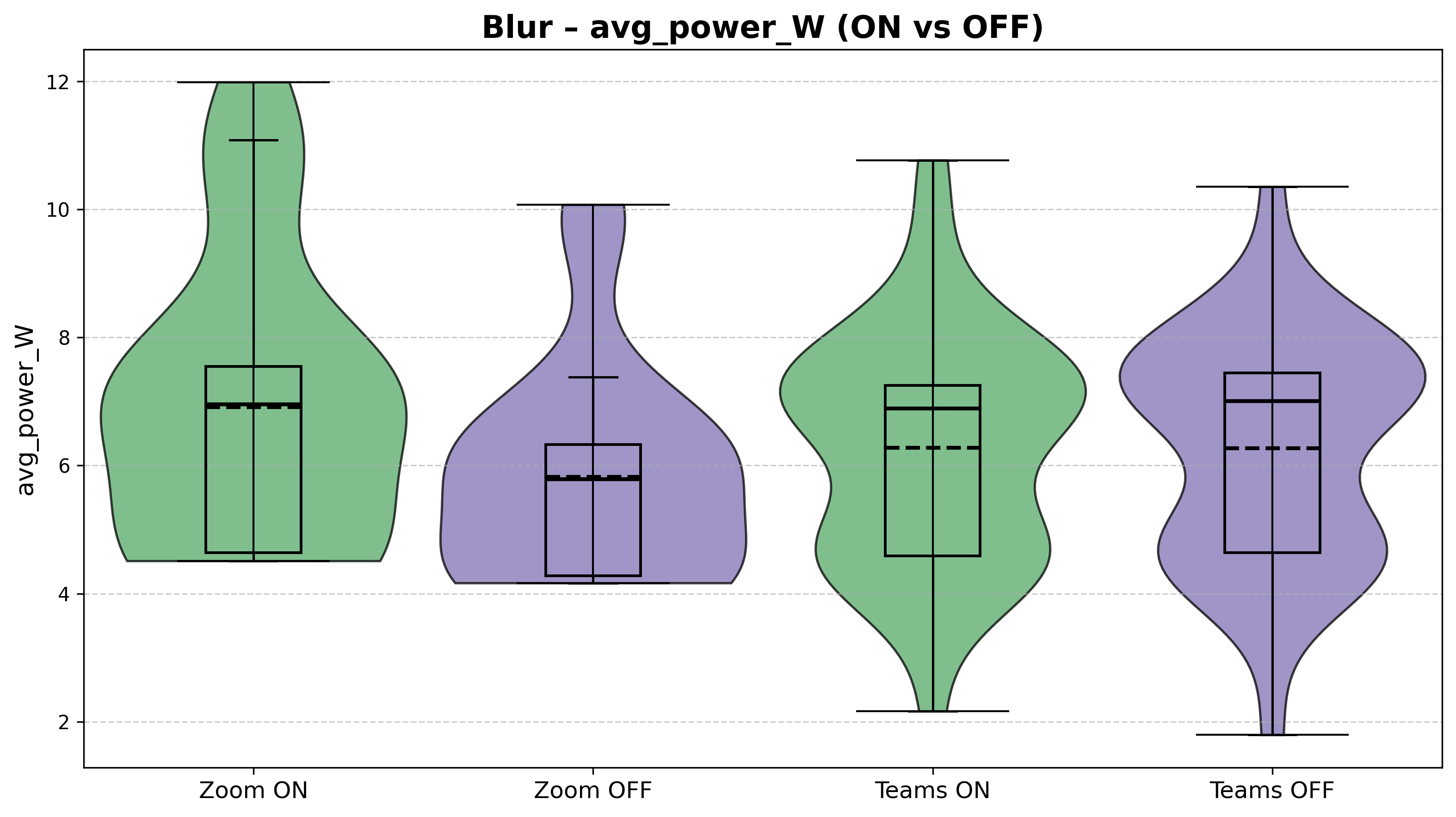 Background Blur (Figures 3–4): Blur introduces the highest variability of any feature tested. Power values span from below 3 W to above 11 W for both applications. For Zoom, enabling blur does produce a visible median increase (from ~5.8 W to ~7.0 W). For Teams, however, the ON and OFF distributions are nearly indistinguishable, with both centering around 6.9–7.0 W with wide, overlapping violin shapes. The EDP plots tell a similar story: large spreads and heavy overlap, particularly for Teams. This high variability makes it difficult to draw strong conclusions about the blur feature’s energy impact without further investigation.