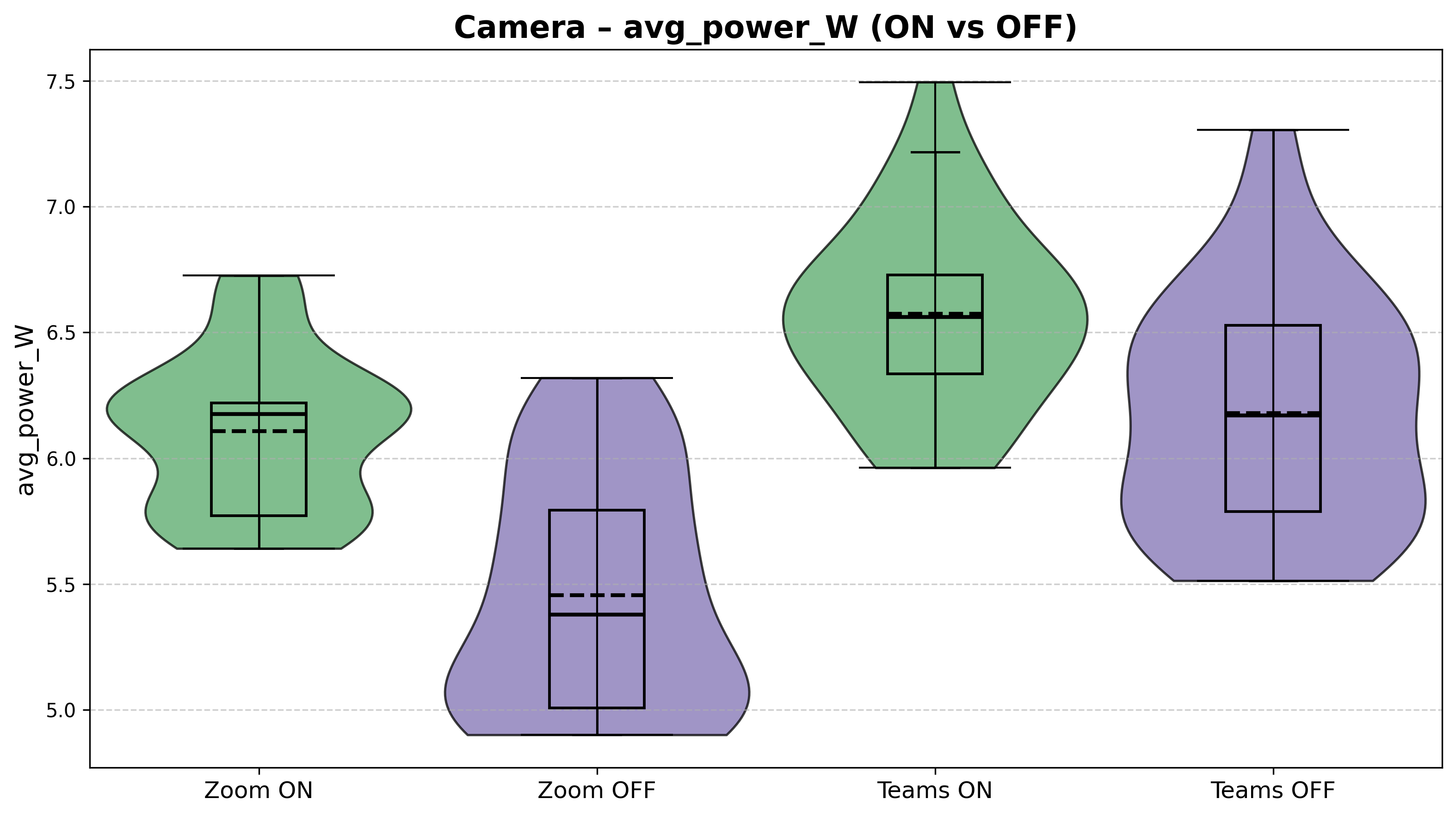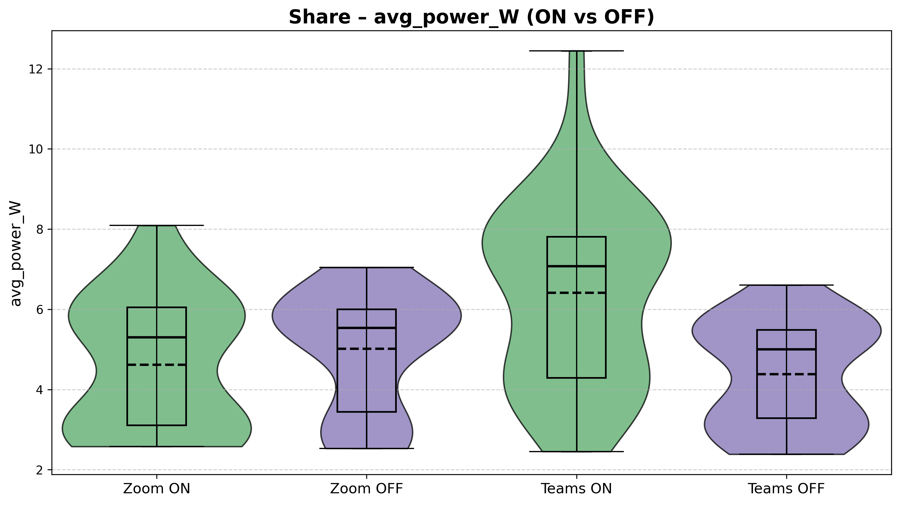 Screen Sharing (Figures 5–6): Screen sharing produces the most asymmetric result between applications. For Zoom, the ON and OFF conditions are fairly close (medians around 5.3 W vs. 5.5 W), with moderate variability. For Teams, however, enabling screen share causes a pronounced jump, where the median rises from roughly 4.9 W to about 7.0 W, and the distribution stretches up to 12.5 W. The Teams ON violin is visibly wider and shifted upward compared to every other condition in this feature pair, making screen sharing the feature where the two applications diverge the most.