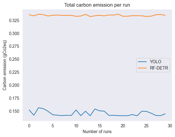 Finally, we appreciated having an indication of the carbon emission that corresponds to using each model, to highlight the environmental impact caused by these energy differences. To this end, we used $C = E * CI$, where C is the carbon emission in gCo2eq, E is the energy in kWh, and CI is the carbon intensity in gCo2eq/kWh. We obtained a carbon intensity value of 184 gCo2eq/kWh for the Netherlands at 6 feb 2026, 11:45 CET from Electricity Maps.11 Eventually, this resulted in the carbon emission values in Figure 5. Note that using RF-DETR would have resulted in more than double the carbon emission, in comparison to YOLOv8.
