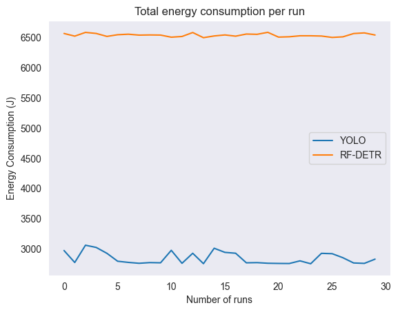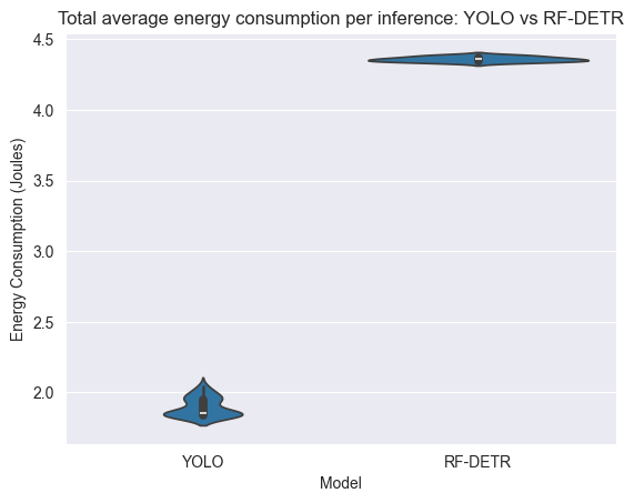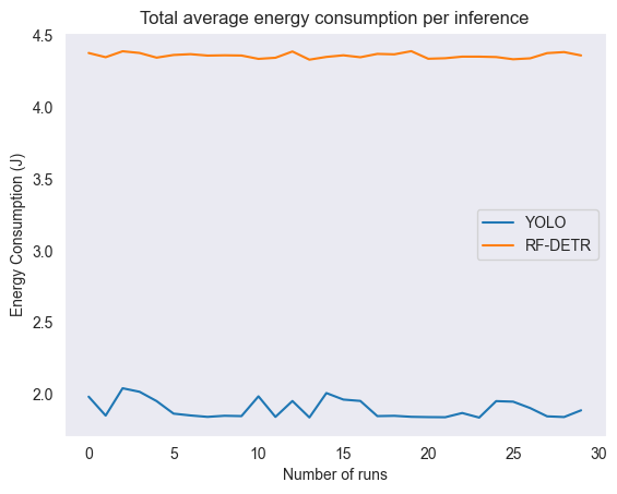 When plotting the total energy consumption per inference and per run (see Figures 3 and 4), we can visualize both the lack of overlap between the measurements and the double energy consumption of RF-DETR.