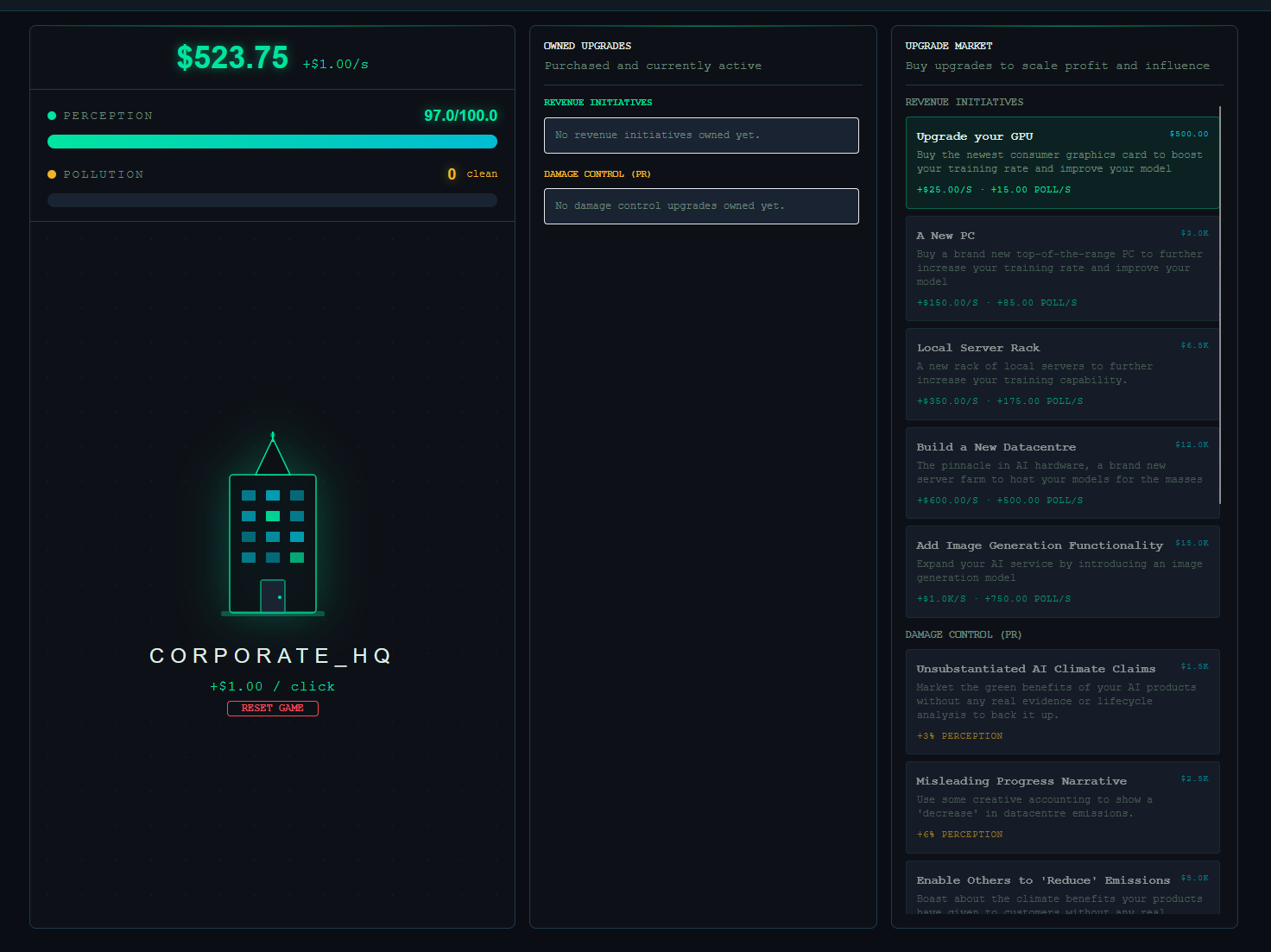 Our project was the creation of ‘Carbon Clicker’ An Engaging Learning tool about Greenwashing in the Tech Sector.